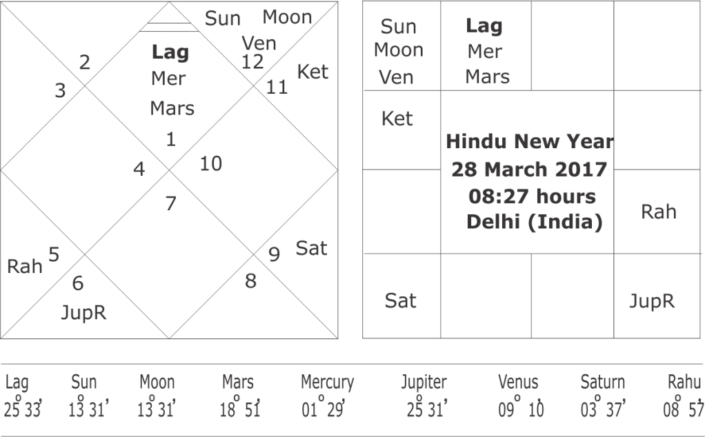 This year the Hindu New Year will start on the 28th of March 2017 at 08:27 hours Delhi (IST). The king of the year will be Mars and minister of the year is Jupiter. The following are the important features of Hindu New Year horoscope.