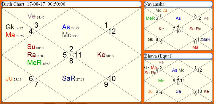 In the Ardra Pravesh horoscope for year 2017 the Gemini (Mithuna) lagna is rising. The Sun, Mars and Mercury are at the ascendant. The hard malefic and dry planets in the ascendant shows heat and less rain in the first half of monsoon season.