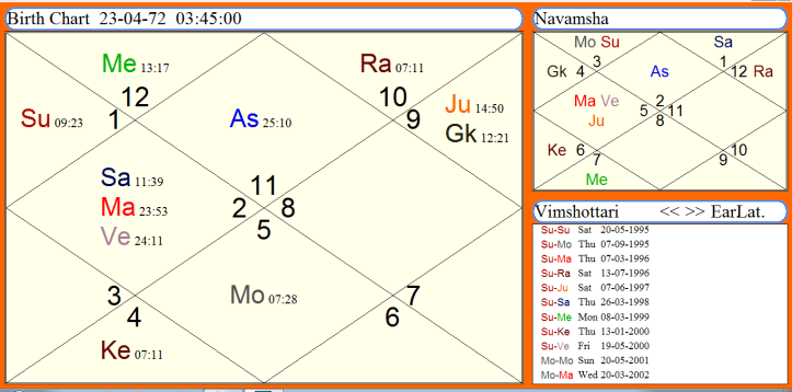 The Sun which is the Karaka of government service is also very strong here. The Sun is in its sign of exaltation receiving the aspect of Jupiter from the 11th house of gains. He got his first job as a stenographer at the age of 23 years during the maha dasha of Sun beginning from May 1995. Later the Sun dasha got him married with a teacher working in the government school. He got married in year 1999 during Sun-Mercury dasha. Since marriage he has enjoyed lots of prosperity and good growth in his career. He and his wife now both are doing well in their respective career in government service.