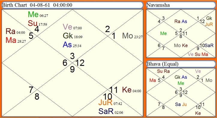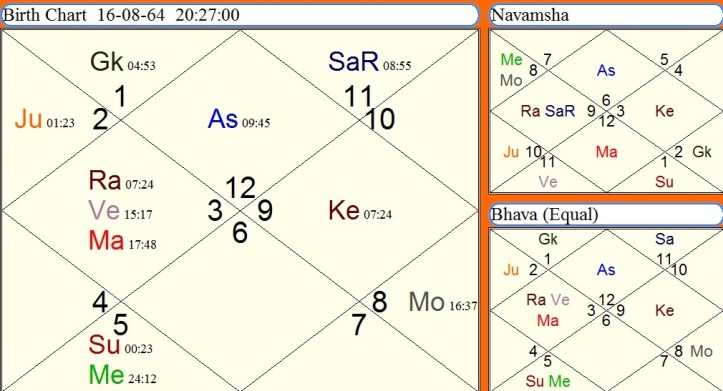 In the Virgo lagna horoscope given above the 10th lord Mercury falls in the 12th house with 12th lord Sun and 8th lord Mars gives lots of breaks in the career of this IT manager. He had lots of job changes in his 18 year long Rahu maha dasha ( 1990 to 2008) and then Jupiter dasha also give him great troubles.