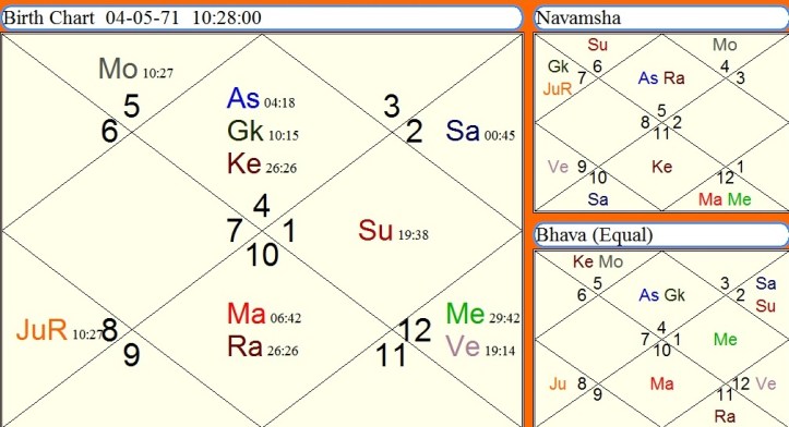 In the Virgo lagna horoscope given above the 10th lord Mercury falls in the 12th house with 12th lord Sun and 8th lord Mars gives lots of breaks in the career of this IT manager. He had lots of job changes in his 18 year long Rahu maha dasha ( 1990 to 2008) and then Jupiter dasha also give him great troubles.