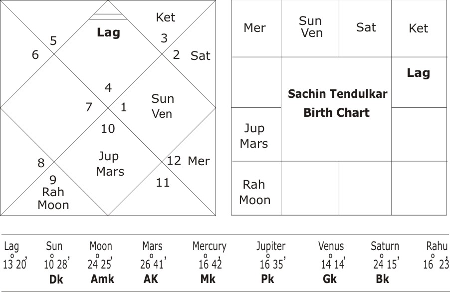 Example 3:- The 6th lord Jupiter along with Mars and lagnesh Moon in 6th house no need to explanation who he is . Sachin Tendulkar became the God of India cricket with the help from strong 6th house and Jupiter in his chart. Because Jupiter significant of expansion provide wisdom through effected area if it is strong .