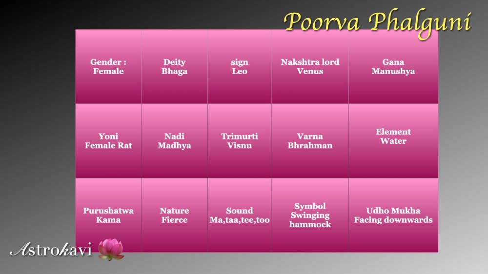 Purva Phalguni nakshatra, in reality, is believed to contain the seed of creation and its ongoing growth, as well as leading to dissolution, destruction, and merger in the universe so that new creation might be made.