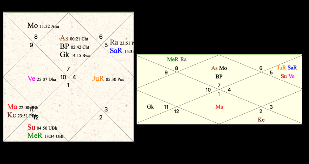 Scorpio is a very intense sign; if the moon is ‘Kendra’ to Mars, it gives them courage; otherwise, who likes to interact with ghosts or something similar? Navamsa, the moon, and Mars are also located in the 1-7 axis, and Ketu is positioned in the 8th house, the house of past lives, serving as the bridge between life and death.