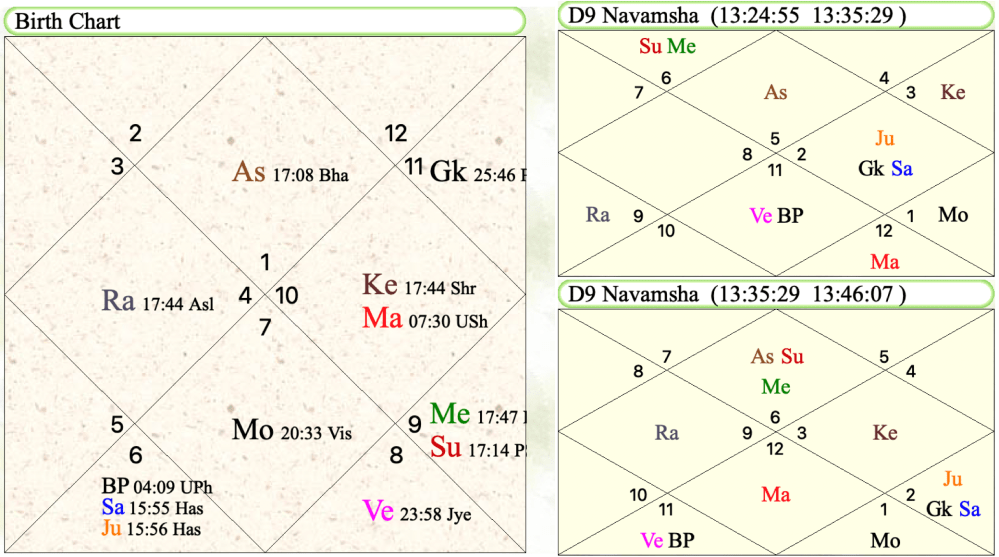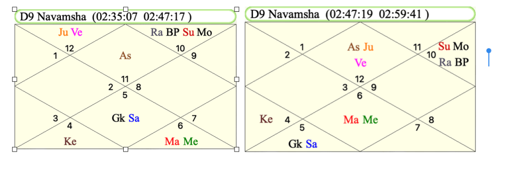 The time of birth was 1:35 pm. corrected time is 1:37 pm. The ascendant and D7 charts remain unchanged, only the correction of the Navamsa chart.