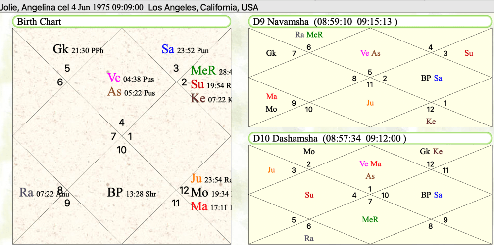 Angelina Jolie’s chart, for example, the celebrity charts, is simple to understand because their lives and romantic lives are publicly exposed, and the quality of their love lives is determined by how well their ongoing Dasha is. What does this have to do with the dignity of love, the conjunction with the 5th house, and the moon’s position?
