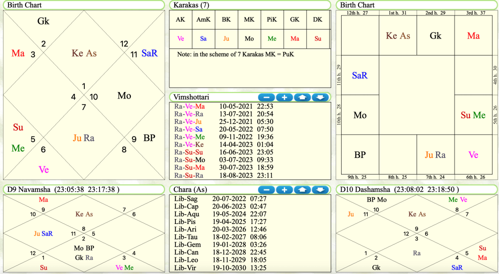 From May 20th on, her Rahu-Venus-Saturn Dasha began. Saturn the Pratyantar Dashanath, the 10th Lord, was in the 11th House in a retrograde position and in the Satbhisha Nakshatra. During this time, she lost interest in her current job and began looking for another good one. She found a new job easily, in the first week of June.