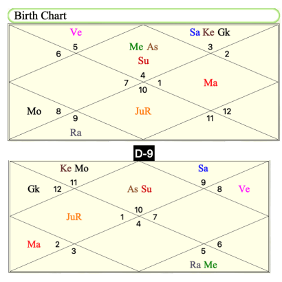 The above combination with Mercury in the Lagna leads the person to remain in his/her imaginative world as the Navamsha also repeats this combination as Rahu is in the fixed zodiac in the D-9 chart, with Mercury in the 8th and Moon in the 1-7 axis she never fully recovers from the first crush.