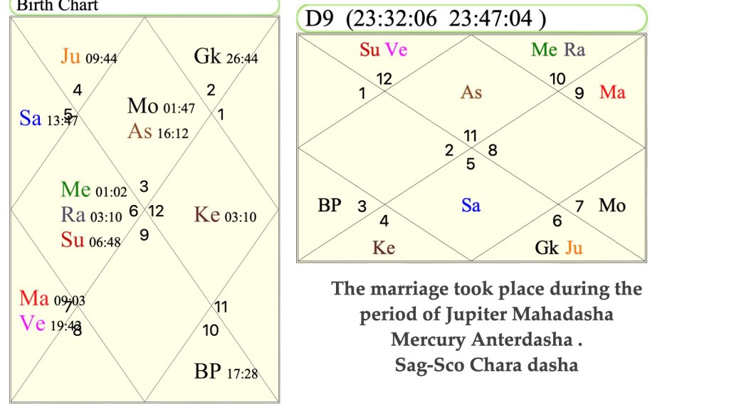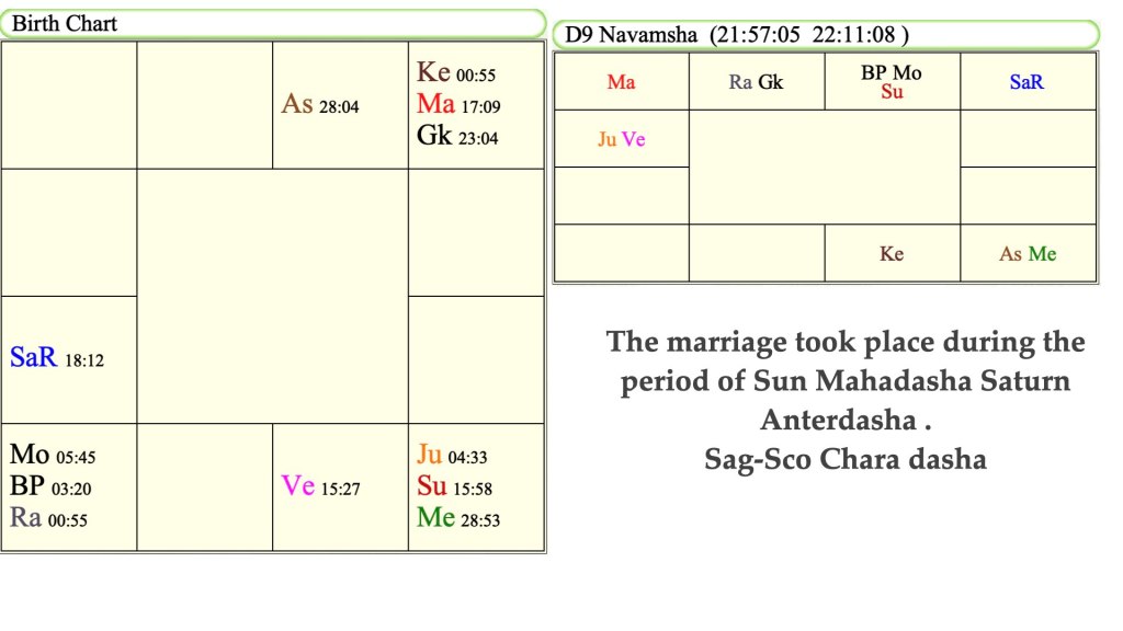 In this chart, we can clearly see the seventh Lord Mercury in the 5th house, which is also Dhara Karak (spouse) and placed in the 7th house of Navamnsa, as well as Venus, which is its own sign and aspected by Jupiter and Vargottma in Navmansa and located in the 5th house in the Navmansa chart.