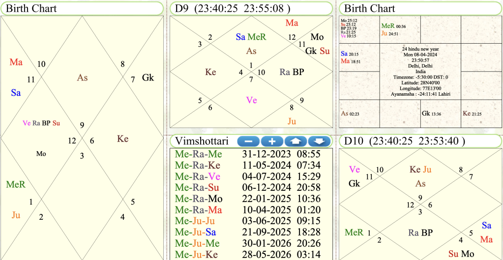 - the Navmansa chart of the Hindu New Year chart. It seems that the conditions are not very favorable, as Aries Lagna is rising and the 10th Lord Saturn is in debilitation in Lagna along with Mercury. Additionally, the 10th House is occupied by Rahu. However, there are some good things too, like Venus occupying its own sign and the exchange of Mars and Jupiter, though it’s not considered good as it involves the 8th and 12th houses. It is important to note that due to the proximity of Mars and Saturn in the month of April, there may be some conspiracy or sudden mishap.
