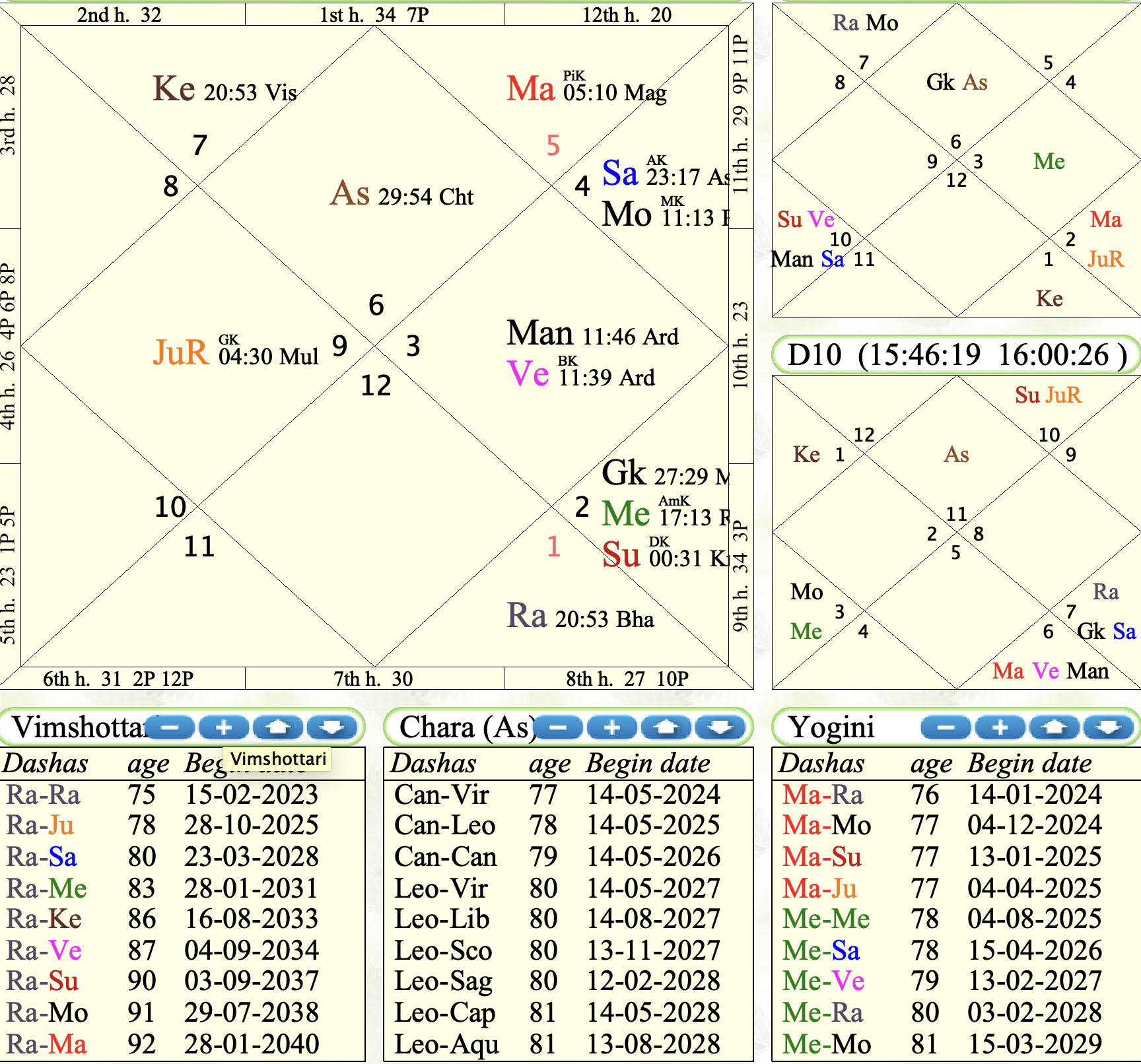 Moreover, Saturn’s exalted status in both the *Navamsa* and *Dashamsa* charts, coupled with its role as the *Lagna* (ascendant) lord of the Dashamsa(d-9), placed in the ninth house, emphasizes Saturn’s strength in this horoscope. This indicates a deep-rooted capacity for hard work, discipline, and a relentless pursuit of goals. Despite the emotional weight of past suffering, this powerful Saturn-Moon combination signifies that with discipline, a person or nation can rise above adversity and achieve remarkable success, just as history has shown with the Jewish people.