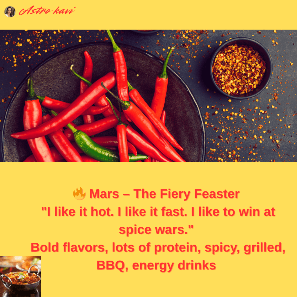 Mars + Ketu: Fasting, detox, survival food vibes.